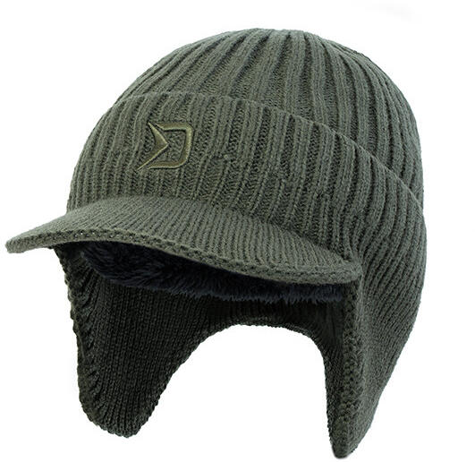 A külső sötétzöld anyag rugalmas és alkalmazkodó, így a kalap univerzális mérettel rendelkezik. Az eleje erős karimával van ellátva, amely védi a szemet és az arcot a napfénytől, valamint az esőtől és a hótól.